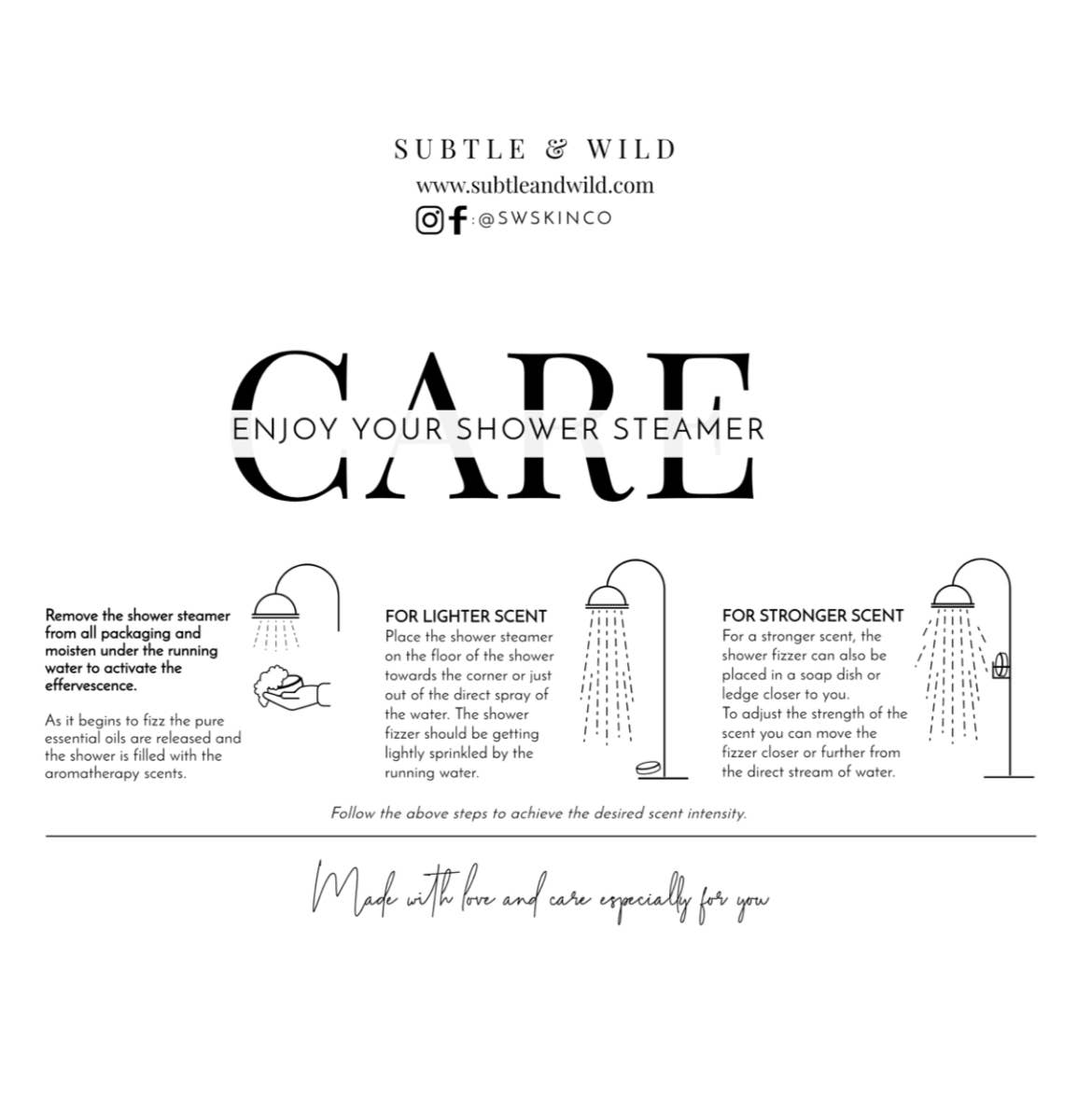 Directions: Turn your shower into a spa by using one of our shower steamers. Lay this tablet on the bottom floor of your shower and turn your water to its hottest setting while closing the door of your bathroom. Allow the tablet to dissolve halfway before entering the shower. Do not put shower steamer directly into the water stream because it needs steam in order to dissolve the proper way.