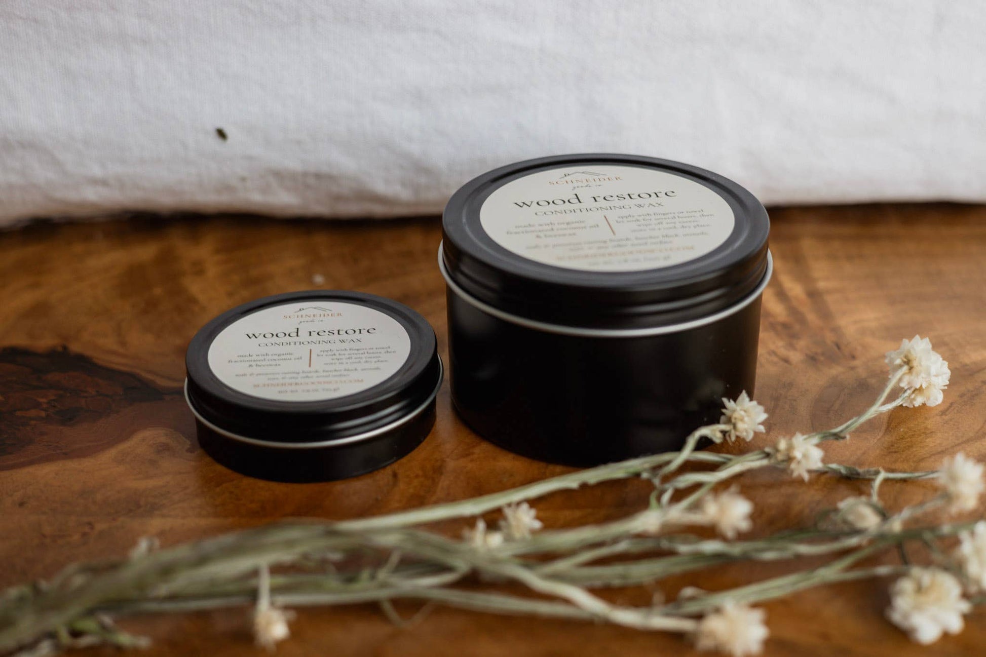 Keep your wooden items in beautiful condition with our Wood Restore wax. Most cutting board conditioners and oils contain mineral oil, a product made from petroleum. Instead, we use organic fractionated coconut oil (highly shelf-stable) and beeswax to create an effective moisturizer for your kitchen and household goods. Try it on cutting boards, wooden utensils, butcher block, wooden toys, and any other wooden goods in your home!